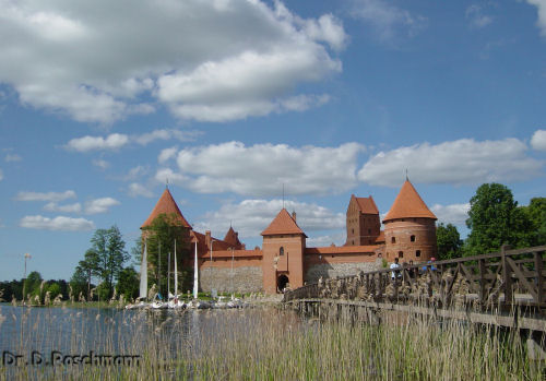 Die Inselburg wird über einen langen Holzsteg betreten. Durch den Torturm gelangt der Besucher in den von Mauern umgebenen Großen Hof. In den Westkasematten, die einst als Waffen- und Lebensmittellager dienten, ist heute ein Teil des Historischen Museums untergebracht. Am Ende des Hofes trennt ein tiefer Graben die Vorburg von der Hauptburg, der durch eine Zugbrücke überwunden wird. Das höchste Bauwerk der Festung ist der Bergfried, ein atemberaubender Blick auf die glasklaren Seen und die kleinen Inseln der Umgebung ist der Lohn für den Aufstieg. Vorbei an Kauen, das zwischen 1921 und 1940 infolge der Annexion von Wilna durch Polen provisorische Hauptstadt Litauens gewesen ist, fahren wir nach Memel, der ehemaligen Hauptstadt des Memelgebietes, des nordöstlichsten Teiles des seinerzeitigen Ostpreußen. Nunmehr unterhält Memel als zwischenzeitlich drittgrößte Stadt Litauens den einzigen Seehafen dieses Landes und ist ein wichtiges Industriezentrum. In der Stadt selbst scheint die Zeit fast stehengeblieben zu sein: Kopfsteingepflasterte Straßen, Fachwerkhäuser und Speicher.