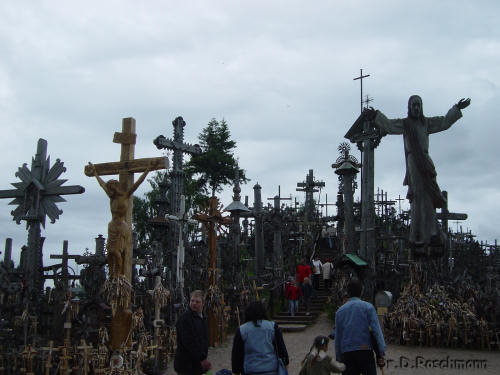 Doch weiter geht die Rundreise. Das erste Ziel am vierten Tag ist der ‚Berg der Kreuze’ etwa 12 km nördlich von Schaulen, für das katholische Litauen ein magischer Ort des Glaubens, aber auch des Nationalbewußtseins. Seit dem 19. Jahrhundert stellen nämlich Pilger auf einem Hügel nahe dem Kulpe-Ufer Kreuze auf, aus den unterschiedlichsten Materialien gefertigt und mit Rosenkränzen und Heiligenbildern behängt. Sie symbolisieren eine Bitte oder sind Ausdruck des Danks – eine Tradition, die aber vermutlich schon viel älter ist. In der Sowjetzeit ist versucht worden, das Denkmal zu zerstören, doch haben die Kreuze nicht so schnell entfernt werden können wie sie von den Gläubigen wieder aufgestellt worden sind – auf eindrucksvolle Weise haben sich hier Frömmigkeit und politischer Widerstand verbündet. Derzeit beträgt die Zahl der Kreuze etwa 15.ooo.