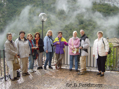 In meiner Vorschau über die Reise vom 5. bis 8. Oktober 2oo5 habe ich angekündigt, das von der September-Reise bewährte Programm zu belassen. Noch während der Kurzbesichtigung von Trient auf der Anreise hat es aber nicht zu regnen, nein, es hat zu schütten begonnen, was allerdings der Freude der Gäste, die am Domplatz im Trockenen gesessen sind, keinen Abbruch getan hat. Unter den Arkaden bzw. Markisen ist nämlich das Geburtstagskind des heutigen Tages mit Sekt gefeiert worden. Auch auf der Weiterfahrt zum Gardasee sind wir aus dem Regenbereich nicht mehr herausgekommen, am nächsten Tag sollten sich dann die Folgen des langanhaltenden Regens zeigen. Am Morgen hätten wir mit unserem Bus über Riva, Torbole, Garda und Peschiera nach Sirmione fahren sollen. Doch die Straße zwischen Limone und Riva war durch einen Erdrutsch verlegt – Dauer der Sperre unbekannt. Also flugs den Linienschiffs-Fahrplan zur Hand genommen und festgestellt, daß als einzig mögliche Alternative nur die über drei Stunden währende Schiffahrt Limone - Sirmione in Betracht kommen kann, um den Ausflugstag – es hat zwischenzeitlich aufgehört zu regnen - doch noch zu retten. Also hat uns unser Fahrer Peter zum Hafen gebracht und ab ging es mit dem Linienschiff kreuz und quer über den See, aber mit Generalrichtung Süden, wobei sich dann sogar die Sonne gezeigt hat. Peter hat versprochen, nach Aufhebung der Straßensperre nachzukommen und uns in Sirmione abzuholen; wäre das nicht möglich gewesen, hätten wir wieder mit dem Schiff zurückfahren müssen.