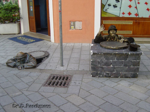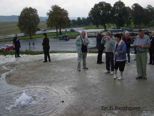 Nach dem gemütlichen Mittagessen in einem heimeligen Kellerlokal geht es dann weiter zur kleinen Stadt Zipser Kapitel. In der Martinskathedrale neuerlich bei einer Führung das Versenken in die Zipser Gotik. Und dann weiter zur Zipser Burg, doch ist dort leider keine Besichtigung möglich. Einige Tage vor Beginn unserer Reise haben dort Dreharbeiten für einen Film begonnen, sodaß die Zufahrt zum Parkplatz gesperrt ist und wir nicht einmal bis zur Burgmauer vordringen können. Wir müssen uns mit dieser Situation abfinden und zur Kenntnis nehmen, daß bei Zusammenstellung der Reise dieser Umstand nicht hatte bekannt sein können. Es ist eben eine Änderung, für die Verständnis aufgebracht werden muß. Da somit mehr Zeit für weitere Vorhaben zur Verfügung steht, legen wir einen Halt in Graubart ein. Im kleinen Naturschutzgebiet auf einem Kalkplateau dieser Gemeinde bietet eine frei zugängliche Mineralquelle wohlschmeckendes Glaubersalz-Wasser. Der kleine Geysir daneben spritzt etwa alle fünf Stunden zehn Minuten lang Wasser fünf Meter in die Höhe - es wäre des Glücks zuviel gewesen, hätten wir gerade den richtigen Zeitpunkt erraten.