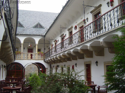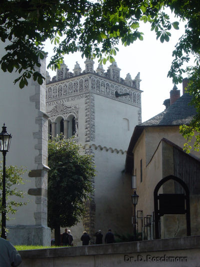Anschließend der Rundgang durch die Stadt, im Mittelpunkt das freistehende Rathaus mit seinem flachen Dach und dem aufgesetzten Turm. An einer Reihe von Bürgerhäusern vorbei geht es zur spätgotischen Heilig-Kreuz-Kirche mit dem frei stehenden Glockenturm im Stile der Zipser Renaissance mit reicher Sgraffito-Verzierung und dekorativer Attika. Nach dem Mittagessen in einem ganz typischen Lokal ruft das massive Bollwerk der Stadtburg, gekrönt von einem nahezu zierlichen Abschluß mit Renaissance-Zinnen. Während der rückwärtige Teil der Burgmauer zugleich Teil der Stadtmauer gewesen ist, gibt es auch zur Stadtseite hin gut ausgebaute Wehrtürme. Die Burgherren waren also nicht immer auf Seiten der Bürger. Heute dient die Burg friedlichen Zwecken, sie ist als Museum zur Geschichte der Stadt und des Tatra-Tourismus eingerichtet. Und dann die von mir in der Vorschau angedeutete Überraschung, die allerdings in weit größerem Ausmaß glückt als geplant. In Deutschendorf ist es, wo ich im Stadtteil Georgenberg die mehrfach umgebaute spätromanische Georgskirche zeigen will. Just bei unserer Ankunft trifft nämlich auch der Bischof von Graz-Seckau, Dr. Egon Kapellari, ein. So führen wir mit unserem Landmann außerhalb der Kirche und dann in dieser angeregte Gespräche. In der Kirche bewundern wir insbesondere den Hauptaltar, wiederum ein Werk des Meisters Paul aus Leutschau. Den Abend verbringen wir nicht im Hotel sondern in einem Lokal im Góralendorf Zdiar. Die gemütliche Einrichtung sowie das prasselnde Kaminfeuer sorgen für Stimmung, die Musik der Drei-Mann-Kapelle ist allerdings zeitweise etwas laut.