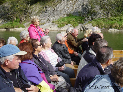 Die Gründung des Ordenssitzes am Durchbruch der Kleinen Donau wurde wegen seiner Ziegelbauweise dann Rotes Kloster genannt, auch wenn heutzutage von roten Ziegeln nicht mehr viel zu merken ist. Ursprünglich von Kartäusermönchen bewohnt, hat sich später hier der Kamaldulenserorden niedergelassen. Heute dient das Kloster mit seiner gotischen St.-Anton-Kirche als Museum, wobei wir im Zuge der Führung tief in die Kultur der Góralen eindringen. Aber dann beginnt die Floßfahrt, die wir schon mit Spannung erwarten. Die auf polnischer Seite von der Hohen Tatra kommende Kleine Donau fließt durch hügelige Landschaft nach Osten und frißt sich nahe dem Roten Kloster durch die Felsen des Pieninen-Gebirges durch. Auf zwei Floßen erleben wir die romantische und in keiner Weise irgendwie gefährliche, aber trotzdem mit einem Hauch von Abenteuer behaftete Floßfahrt, begleitet von den Erklärungen der Steuerleute und dem Gesang eines der Góralen, der uns mit wohltönender Stimme mit Liedern in seiner Muttersprache unterhält. Aber auch dieses Erlebnis kann nicht ewig währen; nach der Floßfahrt entweder in der Kutsche oder zu Fuß zum bestellten Picknick, wo im Freien und unter Musikbegleitung kräftig zugelangt wird.