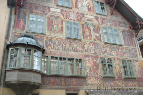 prächtige Fassade mit der Darstellung der Schlacht von Morgarten in uns