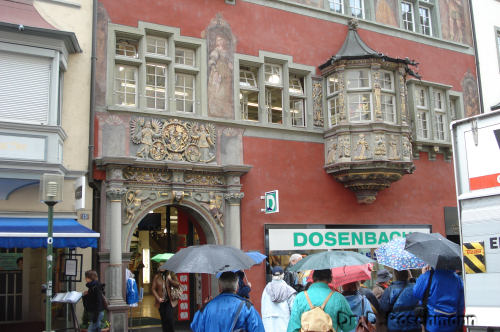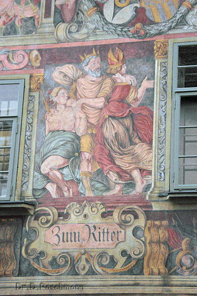 besonders zieht uns das ‚Haus zum Ritter’ an, dessen Fassadenmalerei zu