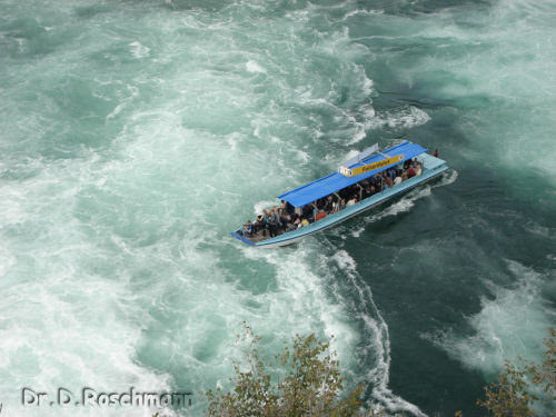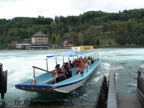 Nach Festungsbesichtigung und Altstadtbummel ist aber eine längere Mittagspause unbedingt erforderlich; wir genießen sie auf der im Kanton Schaffhausen gelegenen Seite des Rheinfalls. Genügend Zeit bleibt, um unterhalb des Falls mit dem Schiff zum Felsen zu fahren, der zwischen den Wassermassen und hoch über der Gischt an der Grenze zwischen den Kantonen Schaffhausen und Zürich emporragt. Der Schiffsführer peilt dabei zentimetergenau die von Strudeln umgebene Landestelle an. Von der Plattform auf der Spitze des Felsens können wir sodann das gewaltige Naturschauspiel so richtig genießen. Da „Seeluft hungrig macht“, freuen wir uns schließlich auf das Mittagessen im Schlössli Wörth oder im Selbstbedienungsrestaurant – Blick auf den Rheinfall inbegriffen. Nach diesem Kultur- und