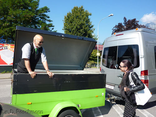 Weiter geht die Fahrt Richtung Innsbruck, unterbrochen von einer Kaffeepause im Rasthaus Trofana. Auf einem Autobahnparkplatz vor Innsbruck - somit muß unser Fahrer nicht in die Stadt hineinfahren - werden ‚wir drei’ abgeholt. Die ‚Gäste aus dem Osten’ fahren weiter.