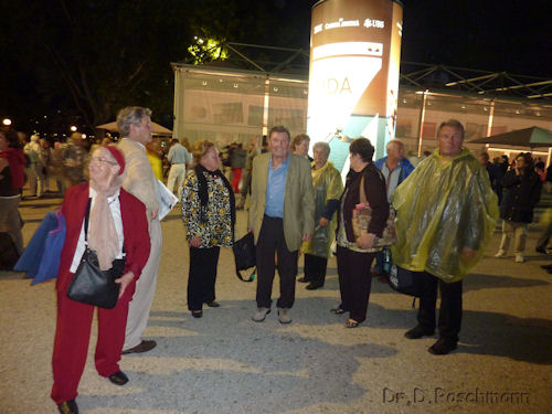 Was wir aber bis zum Abbruch der Vorstellung erleben, ist ein musikalischer Genuß, denn die Aidamusik ist von hinreißender Schönheit. Giuseppe Verdi breitet in der Oper ‚Aida’ in besonders verschwenderischer Fülle einen einzigartigen Melodienreichtum aus. Einerseits in vielen Szenen leidenschaftliche Sinnlichkeit und innige Zärtlichkeit, andererseits wiederum Härte und Festigkeit, schließlich gewaltige Chöre und eine Fülle herrlichster Marschrhythmen. Und über allem ein exotisches Kolorit. Daß abgebrochen werden muß, ist einfach das bei einer Freiluftaufführung in Kauf genommene Risiko. Es ist niemand ungehalten oder traurig, haben wir doch Schönes erlebt. Schon bald sind wir zurück in Dornbirn.