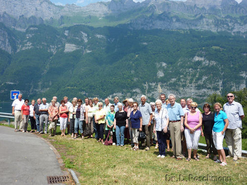 aufragenden Bergen im Hintergrund; Gäste einer früheren Schweiz-Reise