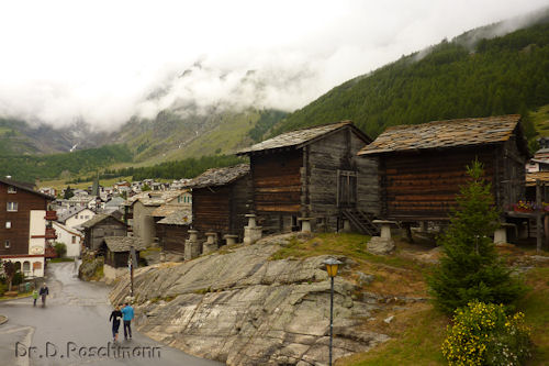 Saas Fee vor allem durch seine Holzhäuser und die Bauweise der Stadel