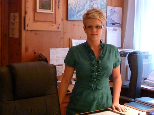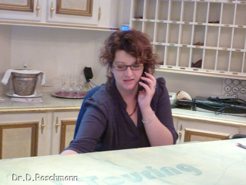 freundliche Rezeptionistin behilflich ist. Vom Hotel ‚Touring’ in Naters