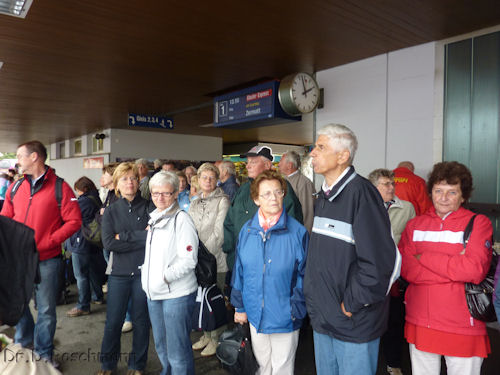Aber schon bei der Einfahrt in das Mattertal wieder Regen und Nebel. Ab Täsch müssen wir - wie vorgesehen - mit dem Pendelzug weiterfahren. In Zermatt peilen wir dann die Lage und blicken in der Talstation der Gornergratbahn auf die Bildschirme, die die Wetterbilder vom Gornergrat und der umgebenden Berggipfel übertragen. Nebel, nichts als Nebel. Trotzdem entschließen sich acht Gäste, die noch nie in der Gegend gewesen sind, mit der Zahnradbahn hinaufzufahren und das ‚Wetter zu überlisten’. Mit einem kleinen Erfolg, wie sich später herausstellen sollte. Die im Tal
