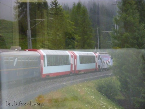 Dann muß ich organisieren. Mit Hilfe des freundlichen Personals der Rhätischen Bahn kann eine den Umständen entsprechende bestmögliche Lösung für die Fahrt von Brig nach St. Moritz ausgearbeitet werden. An dieser Stelle noch einmal ein herzliches Dankeschön nach Chur! Am Abend ist die