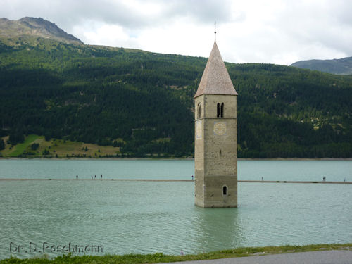 niedrigen Wasserstandes der Kirchturm umrundet werden kann.