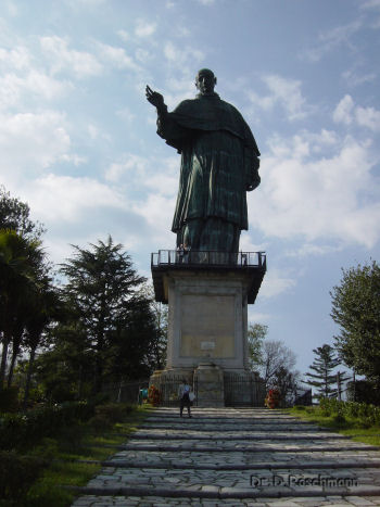 Zum Mittagessen fährt uns unser Kapitän auf die Isola dei Pescatori, die ‚Fischerinsel’, wo Sie köstliche fangfrische Fische speisen können. Da ich die Transferzeiten so einteile, daß Sie gemütlich essen und auch noch die doch sehr kleine Insel durchstreifen können, wird es Nachmittag, bis wir zur dritten und letzten Fahrt, nämlich nach Stresa, abgeholt werden. Von dort aus geht es nur wenige Kilometer nach Süden, wo hoch über Arona die mit Kupferplatten verkleidete Statue des Heiligen Carlo Borromeo grüßt, mit 35 Metern Höhe - einschließlich Sockel - die vielleicht höchste Statue Europas. Aber das Erlebnis ist nicht nur der Anblick der gewaltigen Statue, folgen Sie mir und klettern Sie im Inneren bis zum Kopf hoch. Durch Augen und Mund können Sie herausschauen, die Küstenlinie des Sees überblicken und am anderen Ufer ein weiteres mit den Borromei im Zusammenhang stehendes Bauwerk bewundern, die Rocca di Angera.