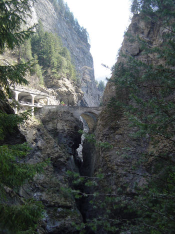 Bevor Sie unser schönes Standorthotel in Meina am Langensee erreichen, gilt es auf der Anreise im Kanton Graubünden noch einmalige Werke der Natur und künstlerischer Schaffenskraft zu bewundern. An der Via Mala ist ein Halt geradezu Pflicht, wenn auch der über unzählige Stufen führende Abstieg zum Flußbett des Hinterrheins, der sich in Jahrtausenden durch das Gestein hindurchgefressen und so die stellenweise viele hundert Meter tiefe Schlucht geschaffen hat, auf dieser Reise wohl kaum möglich ist. Aber schon der Anblick von der Straße aus ist beeindruckend.