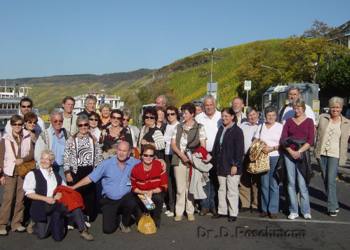 Doch der Reihe nach: Der Besuch der früheren Reichsabtei Ottobeuren ist der richtige Einstieg gewesen, um zwanglos in Reichs- und Kirchengeschichte, aber auch in die Kunstgeschichte einzusteigen. Die gerade vorgenommenen Renovierungsarbeiten im Museum haben uns nicht gestört, es hat genug Bewundernswertes besichtigt werden können. Während der Fahrt nach Norden ist uns der einzige Regen auf dieser Reise geradezu recht gekommen. So haben wir das trübe Wetter ausnützen und uns im Bus einen Film gerade über die Rheinschiffahrt, die am zweiten Reisetag am Programm gestanden ist, als anschauliche Einführung ansehen können. Das Hotel in Brodenbach am Unterlauf des Neckars hat dann den Erwartungen entsprochen. Eine bessere Lage als unmittelbar an der Anlegestelle der Fahrgastschiffe und somit mit uneingeschränktem Blick auf den regen Schiffsverkehr hätten wir uns gar nicht wünschen können. Am nächsten Morgen jedoch zum Schrecken aller Gäste dichter Nebel, der sich bis Bingen und auch während der Überfahrt mit der Rheinfähre nach Rüdesheim nicht gelichtet hat. Alle Gesichter sind ganz lang geworden. Das sollte also die zugesagte schönste und romantischste Schiffahrt werden? Ich habe nur noch beruhigen können. Doch dann ein allgemeines Aufatmen: In Höhe von Assmannshausen ist urplötzlich die Sonne durchgebrochen und hat dem Auge freie Bahn verschafft! Welch ein Jubel hat meine Gruppe umfaßt, als plötzlich unter strahlend blauem Himmel links und rechts Burgen, Ruinen, Kirchen und viele kleine Ortschaften an unserem auf dem ruhigen Wasser des Stromes dahingleitenden Fahrgastschiff vorübergezogen sind. Und immer wieder die Weinberge in der wunderbaren Herbstfärbung des Weinlaubes. Und auf dem Wasser unzählige andere Schiffe. Da mußte einfach jeder an Deck und dieses Erlebnis genießen.
