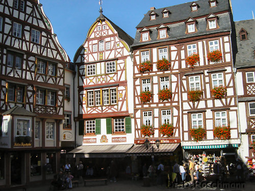 Am dritten Reisetag sind wir über den Hunsrück nach Bernkastel-Kues gefahren, wo wir am Moselufer in den ‚Winzerexpreß’ umgestiegen sind. Die Fahrt durch die Weinberge und der Blick auf die an beiden Ufern der Mosel liegenden Stadt mit der Burgruine Landshut haben ebenso fasziniert wie der anschließende Bummel zwischen den Fachwerkhäusern. Dabei sind der Marktplatz mit Michaelsbrunnen und dem mittelalterlichen Pranger genauso bewundert worden wie das Spitzhäuschen mit seinem schmalen Erdgeschoß und dem weit ausladenden Obergeschoß.