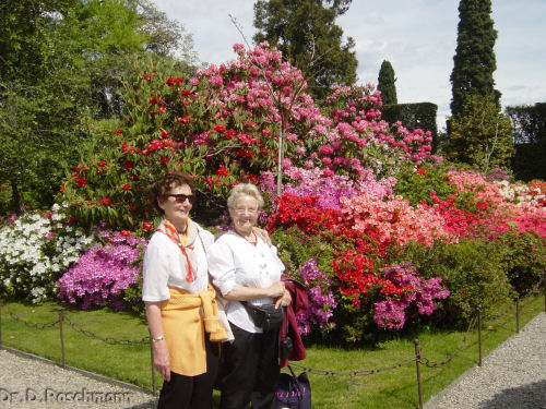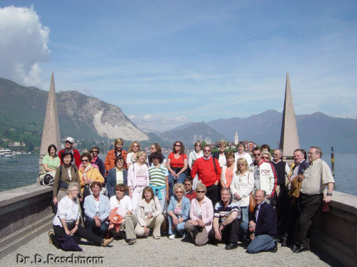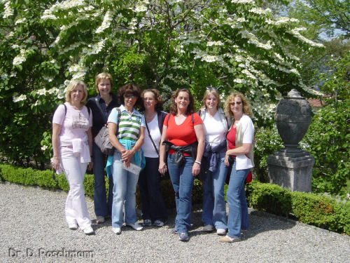 Doch dann geht es zu dem mir seit Jahren bekannten Hotel, in dem ich den ‚Hausgebrauch’ bestens kenne. Am Abend ist noch ein Bummel am Seeufer angesagt; die gute und vor allem milde Luft wird tief und mit Freuden eingeatmet. Am nächsten Morgen heißt es aber früh aufstehen, ist doch eine große Entfernung bis zum italienischen Teil des Lago Maggiore zurückzulegen. Die Zeit vergeht aber wie im Flug – die Fahrt entlang des Westufers dieses Sees ist ja so interessant und abwechslungsreich. Immer wieder Blicke auf Buchten, kleine Inseln, verfallene Festungen und vor allem auf die Blütenpracht. In Stresa werden wir schon von ‚unserem’ Kapitän erwartet, auf geht’s zur berühmtesten Insel des Archipels, der Isola Bella. Die Führung durch das Schloß ist gleichsam ein Einblick in die Familiengeschichte der Grafen Borromeo, doch dann kommt der Barockgarten, auf den wir uns schon alle gefreut haben. Was ist wirklich dran an den weißen Pfauen, sind sie tatsächlich so weiß? Lassen sie sich photographieren? Entspricht das Bild, das ich in die Reisevorschau gestellt habe, der Wirklichkeit?
