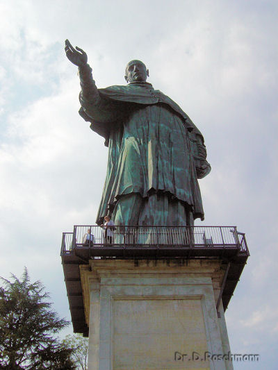 Das Mittagessen nehmen wir also auf der Nachbarinsel ein; im Freien mit Blick auf das Wasser und den regen Schiffsverkehr schmeckt der fangfrische Fisch noch besser. Aber auch von dieser Insel müssen wir Abschied nehmen, wartet doch ein für manch einen meiner Gäste völlig unerwartetes Erlebnis. In Arona heißt es, die höchste Statue Europas nicht nur von außen zu besichtigen sondern in ihrem Inneren hochzuklettern. Den hl. Karl Borromeus stellt diese in ihrer Art einmalige Statue dar. Kopf, Hände und Füße sind in Bronze gegossen, während der übrige Teil aus Kupferplatten besteht.