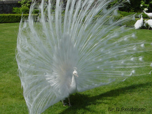 Es ist tatsächlich so; zwei Pfauenmännchen stolzieren, so als ob sie sich ihrer Schönheit bewußt wären, auf dem grünen Rasen herum, von ihrem Harem allerdings nicht sonderlich beachtet. Wenn auch die Töne, die sie von sich geben, für unsere Ohren ganz und gar nicht melodisch klingen, so sind die geschlagenen Räder umso bewundernswerter. Sie beherrschen die Szenerie und lenken fast von dem prachtvoll gestalteten Barockgarten und der Blütenpracht ab.