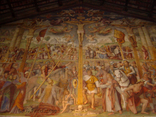 Mit einem Teil der Gruppe fahre ich am nächsten Morgen mit der Standseilbahn auf den Monte San Salvatore hinauf – die Talstation ist ja nur wenige Meter vom Hotel entfernt. Etwa 6oo Höhenmeter müssen in zwei Etappen überwunden werden, dann noch der kurze Aufstieg zum Gipfel, von dem allerdings nichts zu sehen ist. Die höchste Stelle dieses Hausberges von Lugano ist nämlich mit einer kleinen Kirche überbaut, deren Schiff von einer Terrasse gekrönt wird. Die Aussicht von diesem höchsten Punkt weit und breit ist einfach phantastisch, wir können die verzweigten Arme des Luganer Sees verfolgen, überblicken große Teile des Stadtgebietes von Lugano und erkennen jenseits der Bucht von Lugano den anderen Hausberg, den Monte Brè. Doch ein weiteres Erlebnis wartet. Auf dem Weg zur Schiffsanlegestelle ein kurzer Blick in die Kirche Santa Maria degli Angeli mit dem berühmten Kreuzigungsfresko von Bernardino Luini.
