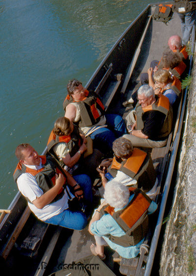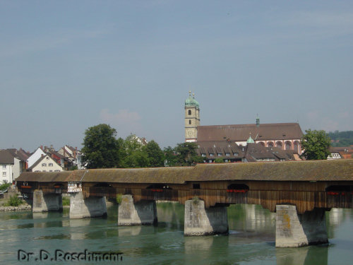 Weiter geht es an den Rhein, zunächst nach Stein. Von der längsten gedeckten Holzbrücke Europas, die - den Strom überquerend - nach Bad Säckingen führt, wollen sich die eifrigen Photographen gar nicht mehr trennen. Aber einige hundert Meter stromabwärts überqueren wir auf der neuen Brücke den Rhein – immer den Blick auf die Holzbrücke mit dem Fridolinsmünster im Hintergrund gerichtet.