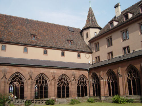 Mit der ‚MS Lällekönig’ dann in fast zweistündiger Fahrt nach Basel - trotz der nicht großen Entfernung geht es nicht schneller. Einerseits, weil einige Anlegestellen angefahren werden müssen, vor allem aber deshalb, weil zwei große Staustufen mit ihren gewaltigen Schleusenanlagen passiert werden müssen. So eine geruhsame Schiffahrt auf dem ruhig dahinfließenden Strom kosten ‚wir Landratten’ so richtig aus. Aber dann taucht Basel auf, das Münster grüßt von erhöhtem Standort herunter. Schnell ausgeschifft und auf zum Münster, das in seinen älteren Teilen auf die romanische Bauepoche zurückgeht, dessen beide Türme aber gotisch sind. Wir lassen den schlichten romanischen Kirchenraum sowie die ebenfalls romanische Krypta auf uns wirken, bevor wir uns dem Anblick der beiden Kreuzgänge mit ihren Grabmälern hingeben.