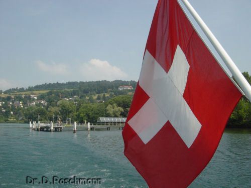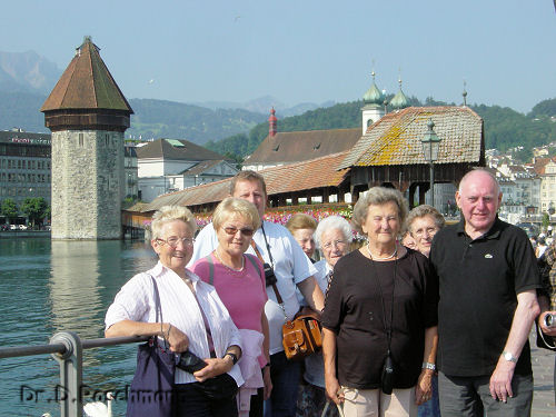 Am nächsten Tag steht der Vierwaldstätter See auf dem Programm. Wir durchstreifen Luzern, diese liebe Stadt am Westende des Sees, wo die Reuß diesen verläßt und gleich von zwei gedeckten Holzbrücken überspannt wird. Die für Kunsthistoriker interessantere Brücke ist die Spreuerbrücke mit ihren Totentanzbildern, die bekanntere ist aber die Kapellbrücke mit dem Wasserturm, vielleicht neben dem Matterhorn d a s Sinnbild für die Eidgenossenschaft. Daß sich die Gäste vor dieser Brücke zum Gruppenbild aufstellen, ist wohl naheliegend.